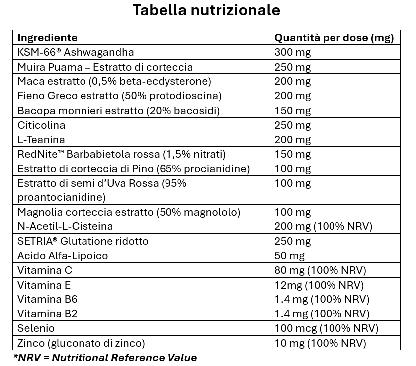 TESTOWIT contiene Muira Puama (Ptychopetalum olacoides Benth.) estratto di corteccia (D/E: 4/1), RedNite™ (succo di radice di Barbabietola rossa in polvere titolato all’1,5% in nitrati), Maca (Lepidium meyenii Walp.) estratto di radice titolato allo 0,5% in beta-ecdysterone, Fieno Greco (Trigonella foenum-graecum L.) estratto di semi titolato al 50% in protodioscina, gluconato di zinco, KSM-66® Ashwagandha (Withania somnifera) estratto di radice titolato al 5% in withanolidi, Oligopin® (estratto di corteccia di Pino Marittimo Francese titolato al 65% in procianidine oligomeriche), Estratto di semi d’Uva Rossa titolato al 95% in proantocianidine, acido borico, gluconato di rame, cloridrato di piridossina (Vitamina B6), colecalciferolo (Vitamina D3), D-alfa-tocoferil acetato (Vitamina E) e piperina da Pepe Nero (Piper nigrum L.).