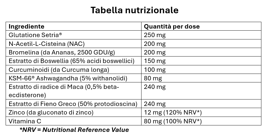 Questo bundle combina tre integratori complementari per l’equilibrio e la resilienza del sistema immunitario. TESTOWIT fornisce 560 mg di Muira Puama, 400 mg di barbabietola RedNite™, 240 mg di Maca, 240 mg di Fieno Greco (50% protodioscina), 80 mg di KSM-66® Ashwagandha, oltre a zinco e antiossidanti per sostenere ormoni ed energia. RESET apporta bromelina (2500 GDU/g), acidi boswellici al 65% da Boswellia, curcuminoidi, corteccia di pino (90% proantocianidine) e nattokinasi per ridurre l’infiammazione, migliorare la circolazione e proteggere il cuore. GLUTADETOX include 250 mg di Glutatione Setria®, 200 mg di NAC, 150 mg di cardo mariano (80% silimarina), vitamina C, acido lipoico, vitamina E, selenio e vitamina B2 per depurare il fegato e contrastare lo stress ossidativo.