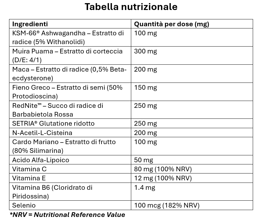 TESTOWIT contiene Muira Puama (Ptychopetalum olacoides Benth.) estratto di corteccia (D/E: 4/1), RedNite™ (succo di radice di Barbabietola rossa in polvere titolato all’1,5% in nitrati), Maca (Lepidium meyenii Walp.) estratto di radice titolato allo 0,5% in beta-ecdysterone, Fieno Greco (Trigonella foenum-graecum L.) estratto di semi titolato al 50% in protodioscina, gluconato di zinco, KSM-66® Ashwagandha (Withania somnifera) estratto di radice titolato al 5% in withanolidi, Oligopin® (estratto di corteccia di Pino Marittimo Francese titolato al 65% in procianidine oligomeriche), Estratto di semi d’Uva Rossa titolato al 95% in proantocianidine, acido borico, gluconato di rame, cloridrato di piridossina (Vitamina B6), colecalciferolo (Vitamina D3), D-alfa-tocoferil acetato (Vitamina E) e piperina da Pepe Nero (Piper nigrum L.).