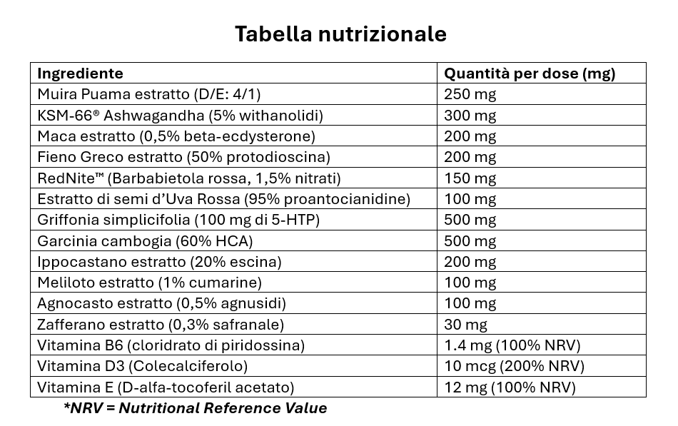 TESTOWITcontiene Muira Puama (Ptychopetalum olacoides Benth.) estratto di corteccia (D/E: 4/1), RedNite™ (succo di radice di Barbabietola rossa in polvere titolato all’1,5% in nitrati), Maca (Lepidium meyenii Walp.) estratto di radice titolato allo 0,5% in beta-ecdysterone, Fieno Greco (Trigonella foenum-graecum L.) estratto di semi titolato al 50% in protodioscina, gluconato di zinco, KSM-66® Ashwagandha (Withania somnifera) estratto di radice titolato al 5% in withanolidi, Oligopin® (estratto di corteccia di Pino Marittimo Francese titolato al 65% in procianidine oligomeriche), Estratto di semi d’Uva Rossa titolato al 95% in proantocianidine, acido borico, gluconato di rame, cloridrato di piridossina (Vitamina B6), colecalciferolo (Vitamina D3), D-alfa-tocoferil acetato (Vitamina E) e piperina da Pepe Nero (Piper nigrum L.).